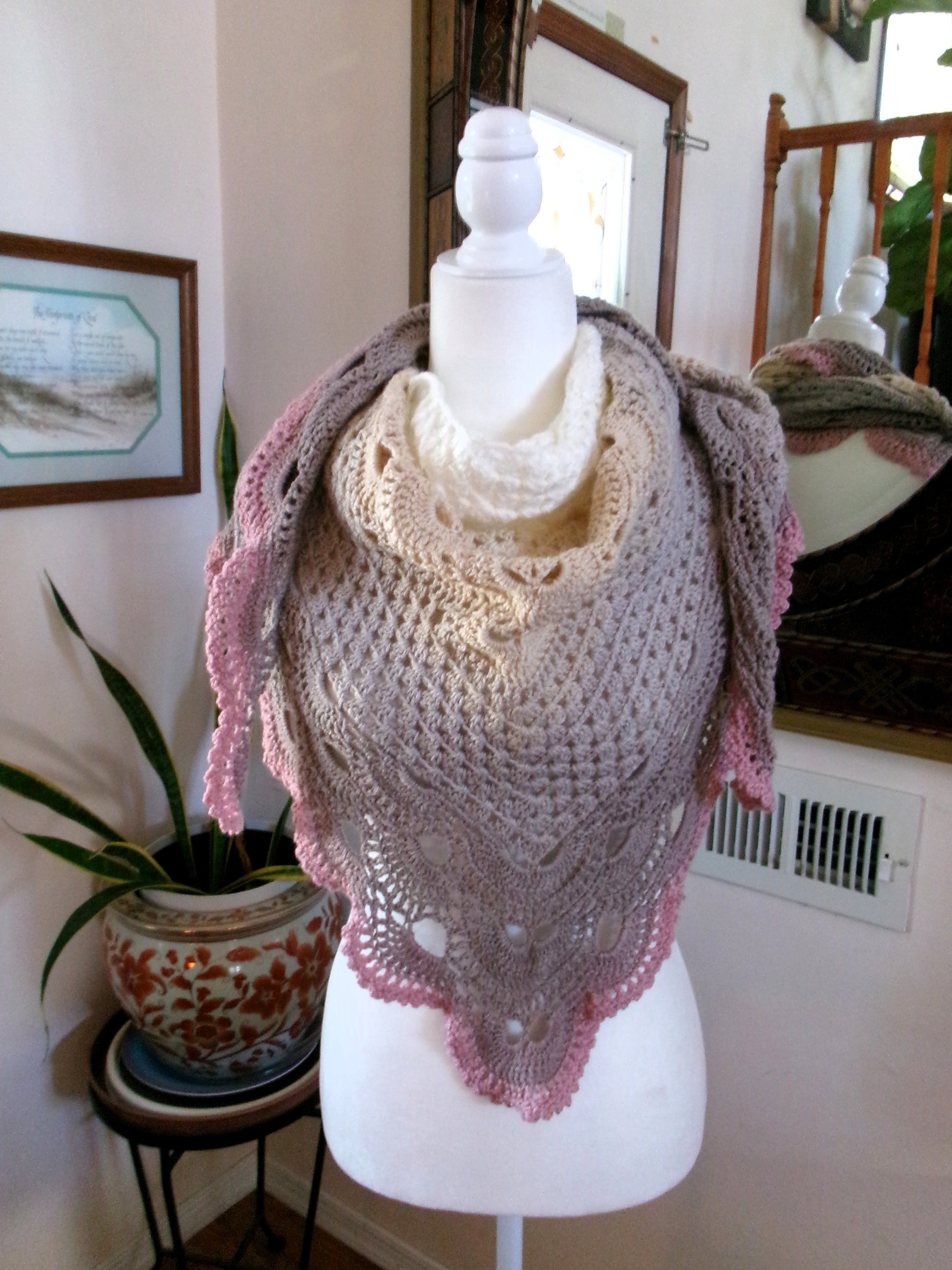 Hand crocheted by me, this is a triangular piece with a soft, romantic feel. It features a delicate gradient that fades from creamy ivory at the top into a gentle taupe, finishing with a dusty pink border along the scalloped edge.